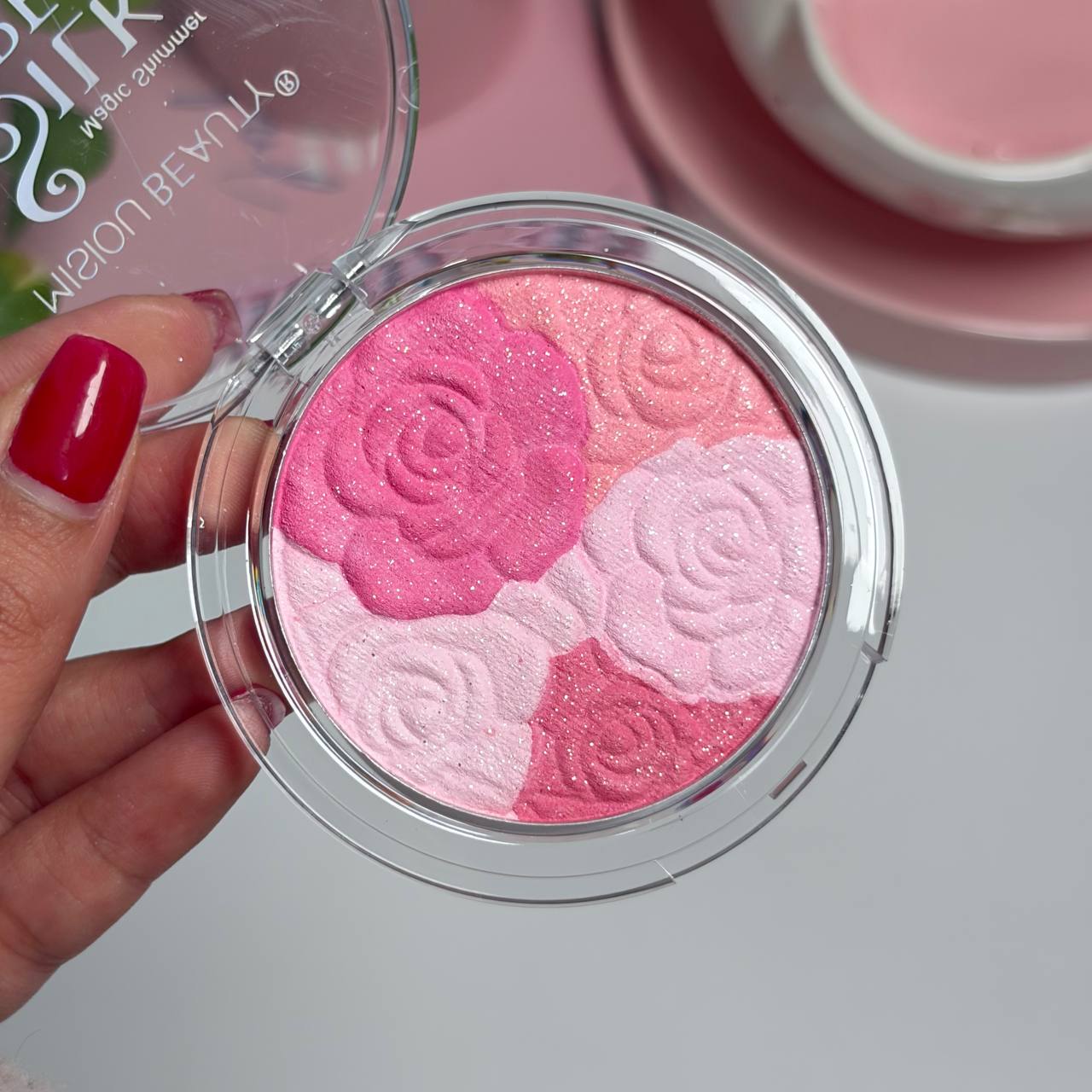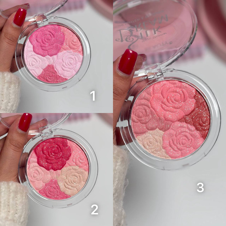 رژگونه و هایلایتر با طرح برجسته گل رز، پیگمنت و رنگ دهی بالا، کیفیت عالی، با ترکیب فوق العاده سه رنگ صورتی باربی و هلویی دارای شاین ریز و جلوه زیبا و پکیجینگ شیک
